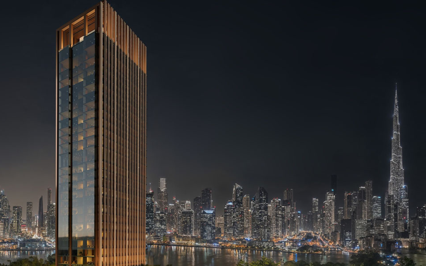 Contemporary landmark design blending glass and metal façade with urban park surroundings and waterfront views. Designed to reflect Dubai’s ambition and global business excellence.